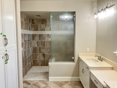 The other re-selection was the shower door for the bathroom in the 2nd bedroom. We were less than thrilled with the replacement choices so we opted for the one they recommended as the closest match. The shower's wall tile is white and decorated with lots of gold design. The plumbing fixtures and towels racks are gold as well.